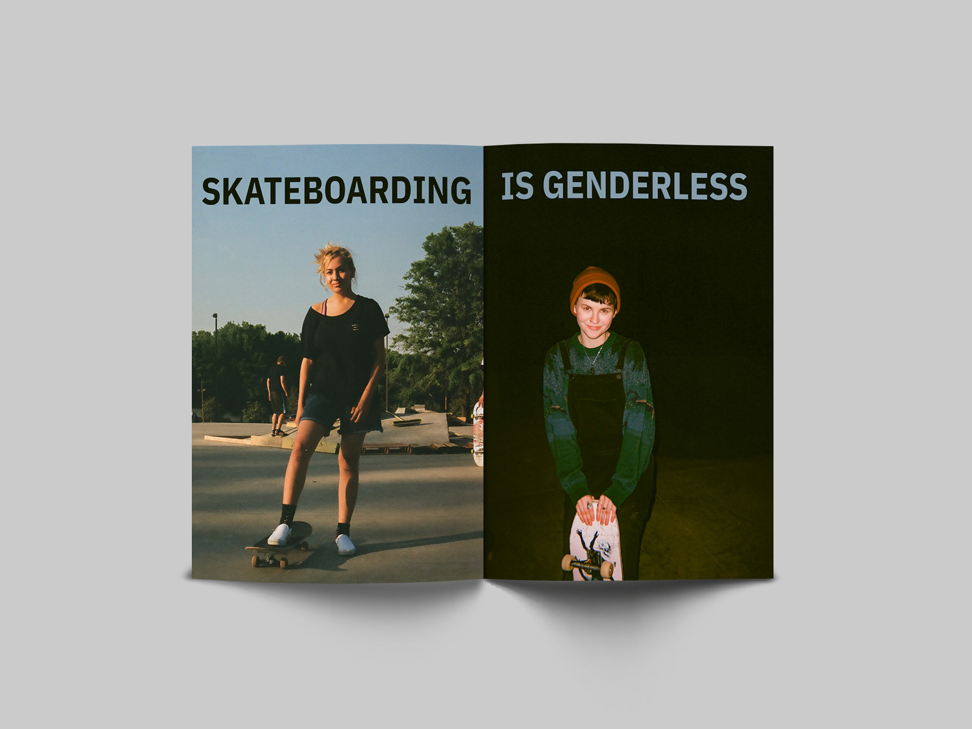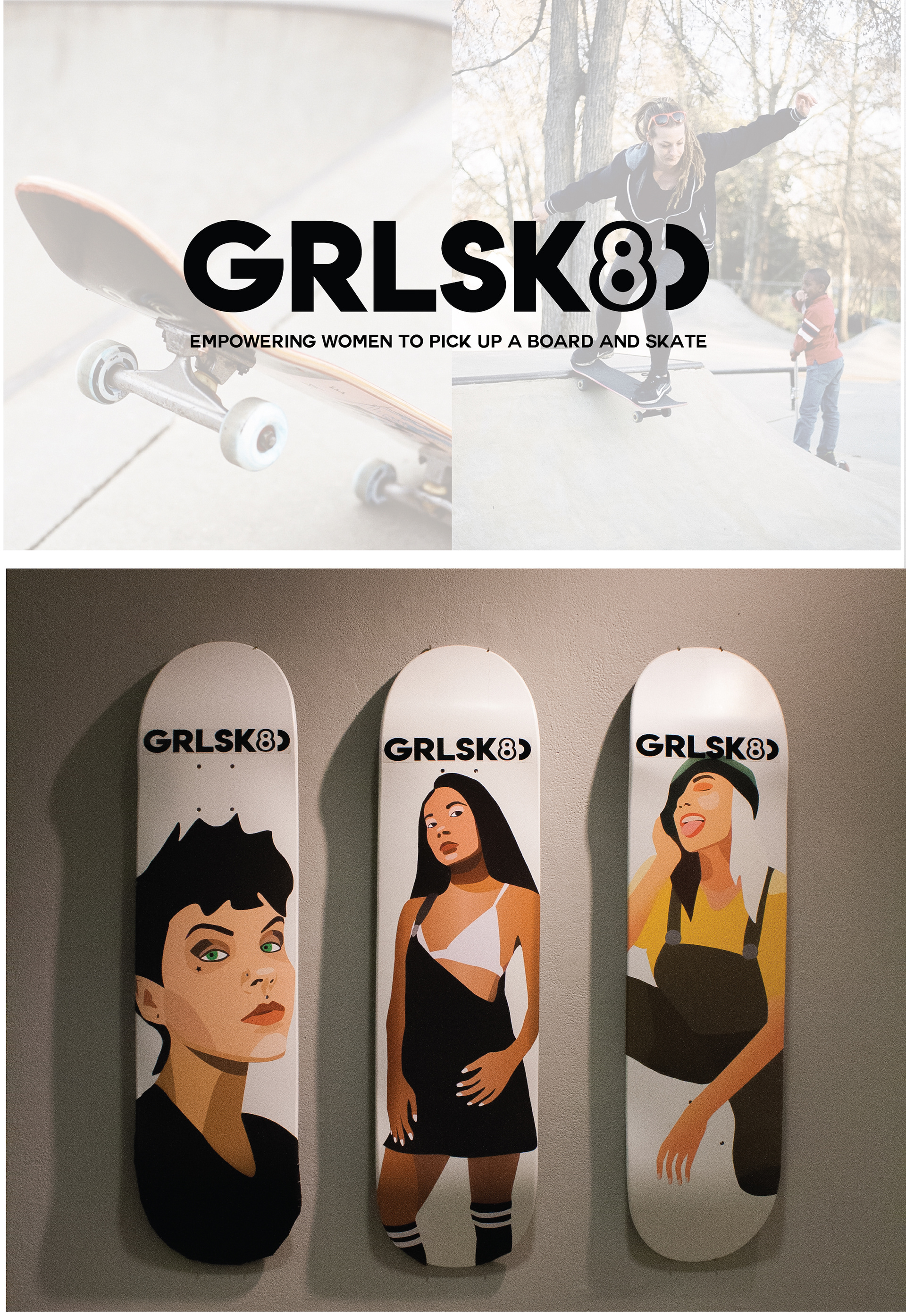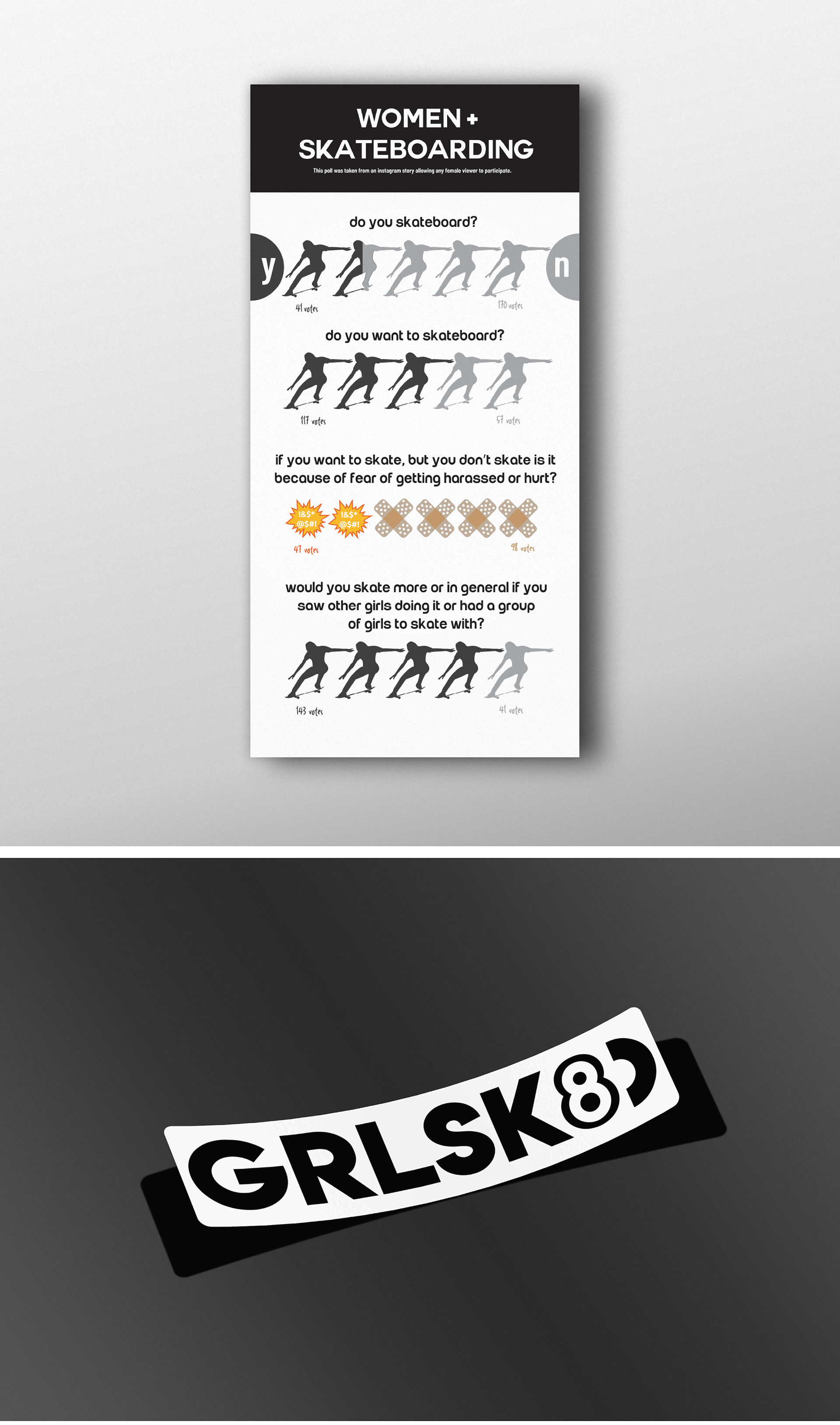 After dipping my toes into the skate community for the last year, I realized there’s a stigma that needs to be changed. The goal of GRLSK8D is to expand the representation of women in the skateboarding community and allow women to feel supported and welcomed into the space. Branding began by thinking of a way to push girls to get out and skate. I wanted to capture the feeling of your friend saying “Girl skate!” The logo design advanced this idea by also encompassing the shape of a skateboard and using text lingo smiley faces, as a way to relate to alternative slang and lifestyle in skate culture. Another layer to the logo is that it can be read as “Girl skated,” which will promote people to use the logo as a proud stamp when they skate somewhere. When a girl goes to a space and she skates, she can mark that area with the sticker to pass the message and change the stigma. Hopefully when another woman comes to that same space and sees this, even if she is alone by gender, she can see this logo and be reminded that she isn’t alone. Through the stickers of the logo, zine, video, and skate decks, these deliverables seek to promote confidence and encouragement the local community of Charlotte is lacking for women to skate.