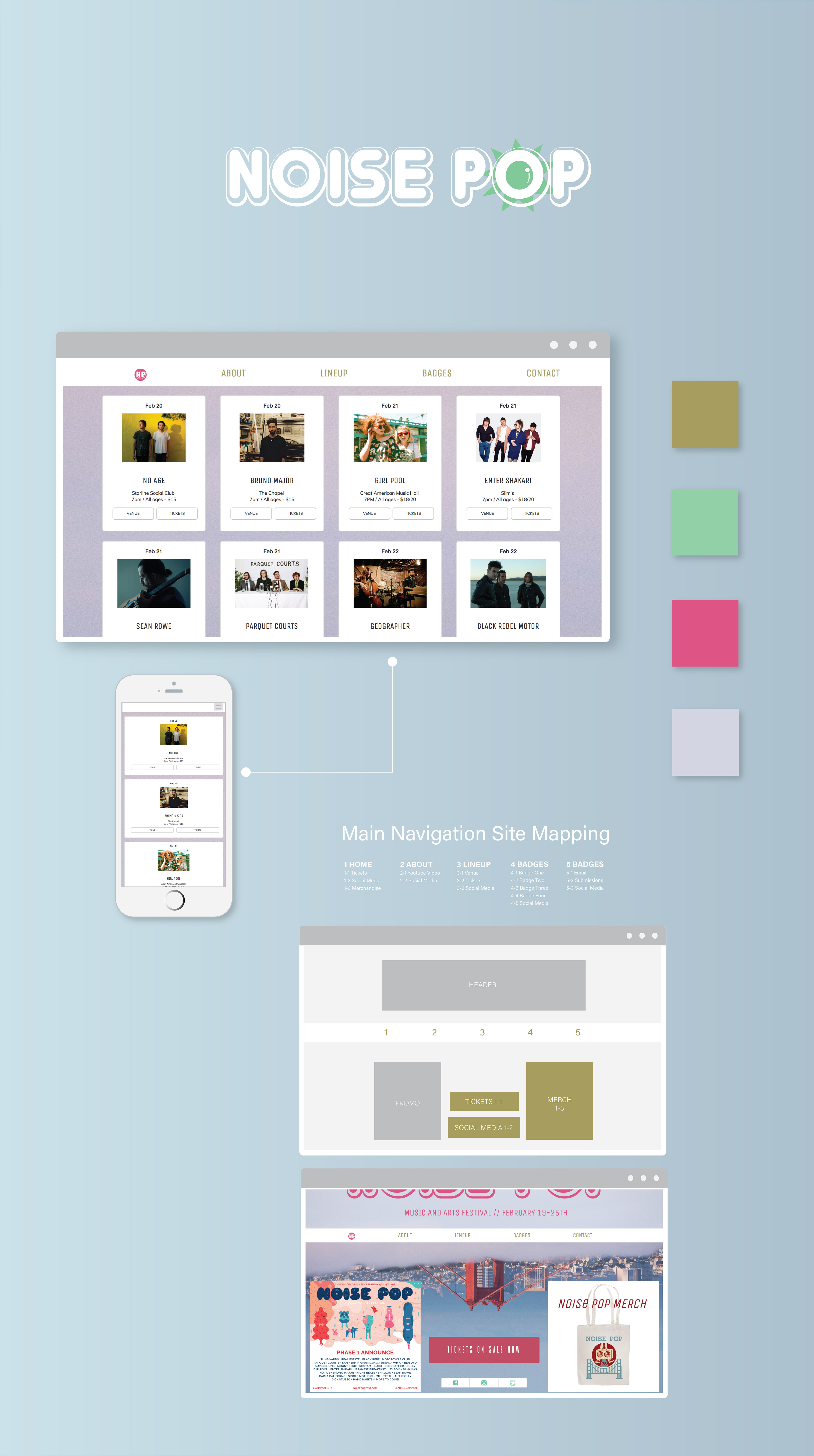 Noise Pop is an annual music festival held in San Francisco, CA during middle to late February. The festival consists of diverse indie and alternative artists which perform at many different venues in the area. Their current website for the festival has many issues with navigation, structure, and lacking comprehensive presentation of information. This design seeks to restructure and simplify the existing website. Using bootstrap and responsive elements in Adobe Dreamweaver, I recreated the Noise Pop website with photography from the web and my own graphics created in Adobe Illustrator.